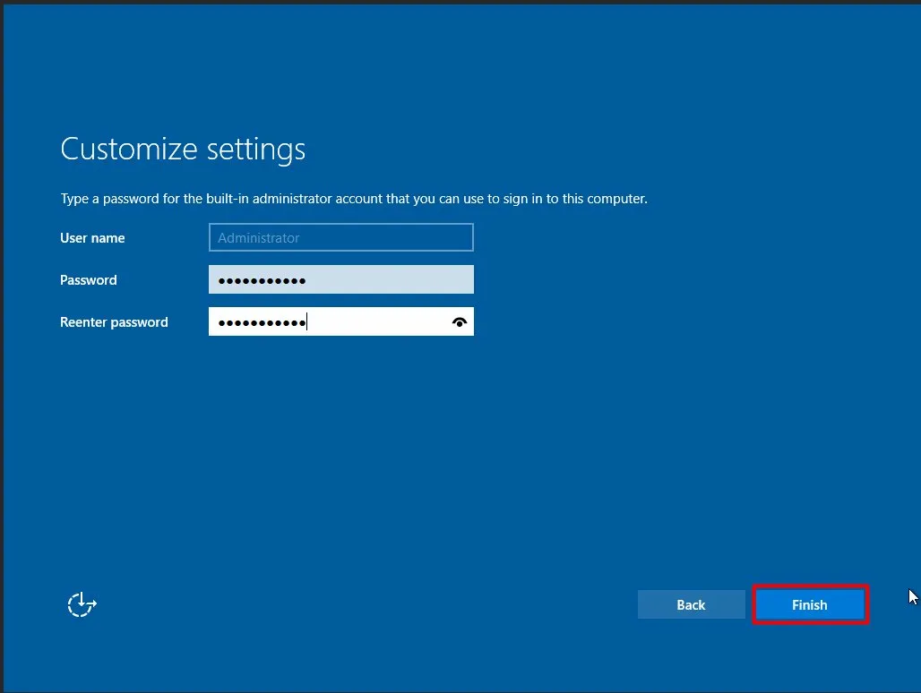 On the **Customize settings** screen, you will be asked to set a password for the built-in **Administrator** account. This is the primary account used to access and manage your Windows Server.