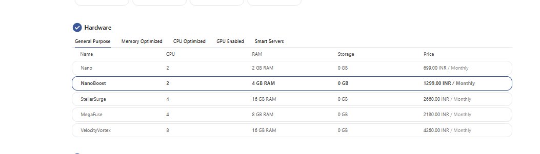 Choose a hardware plan that matches your workload requirements. NeevCloud offers the following categories: