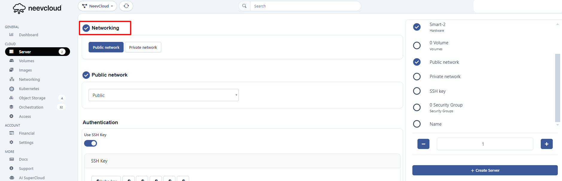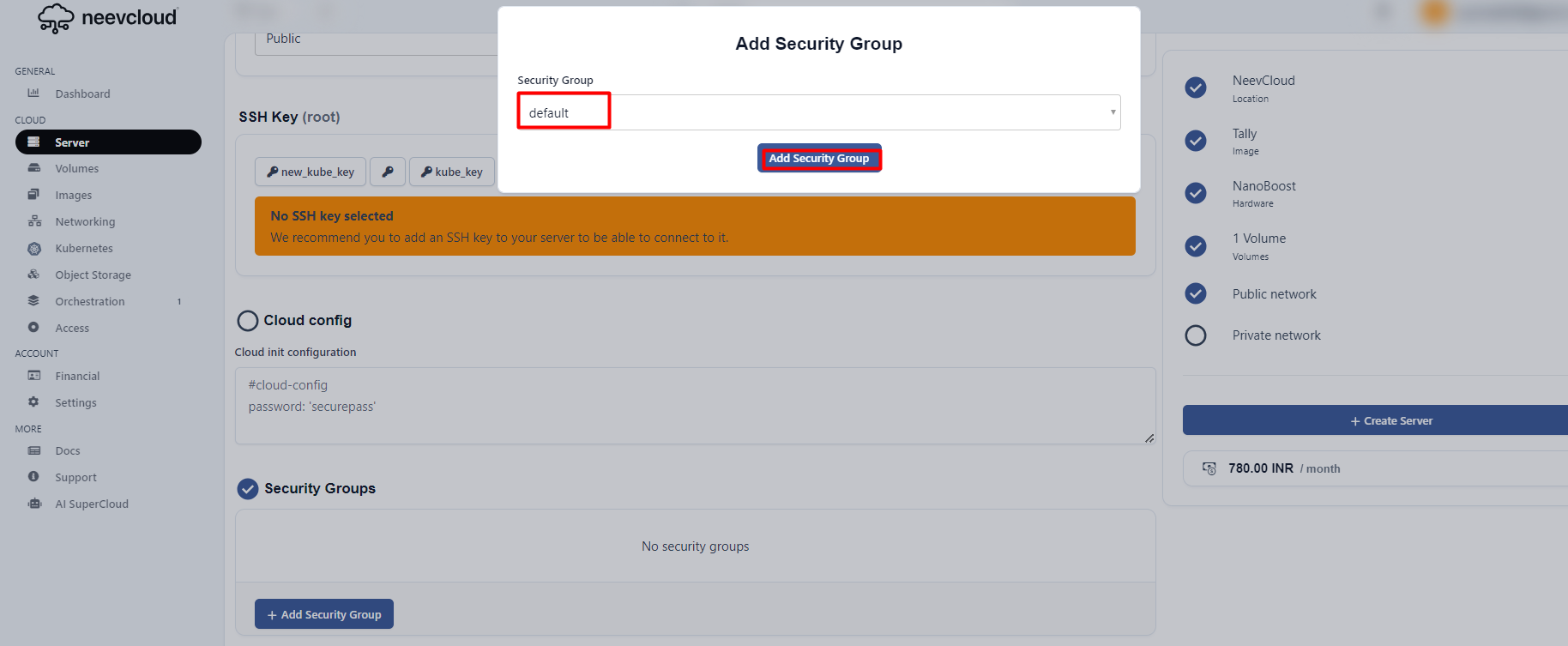 If you already have an SSH key, select it. If you don't have one, please follow this [link](https://docs.neevcloud.com/neevcloud-products/access-details/ssh-key) to generate an SSH key.