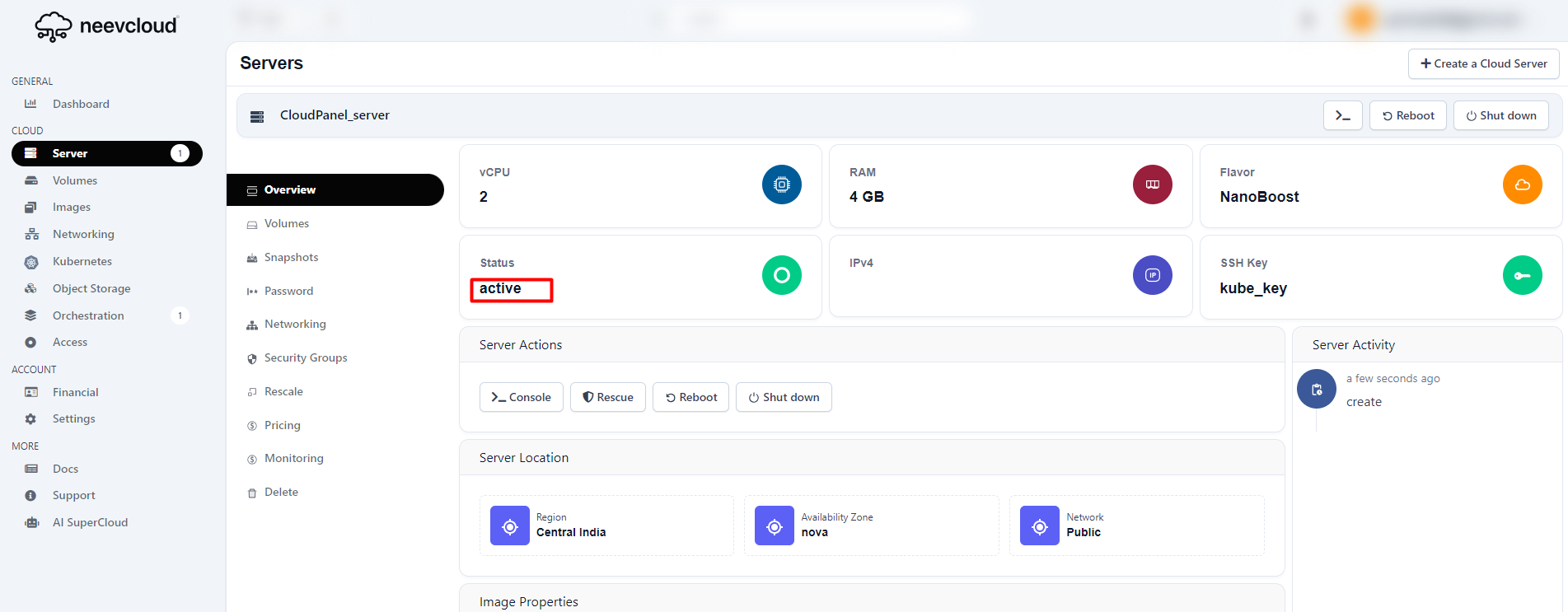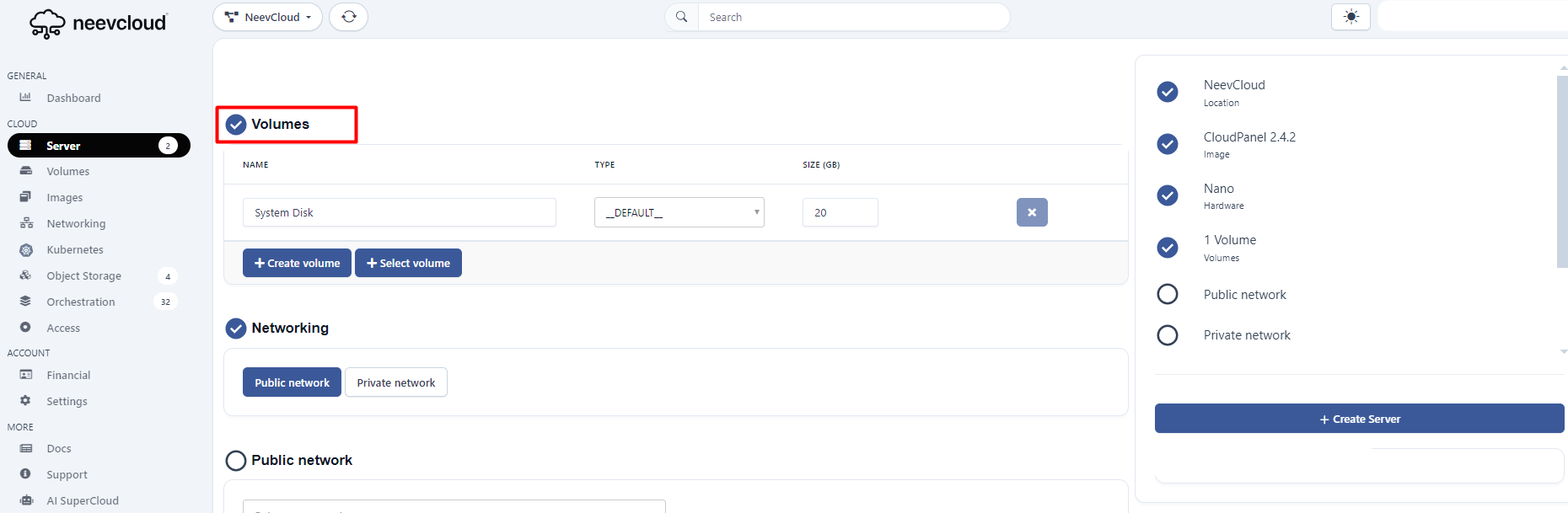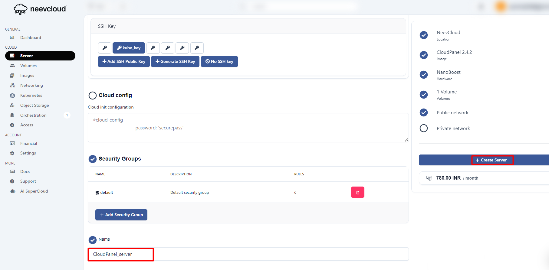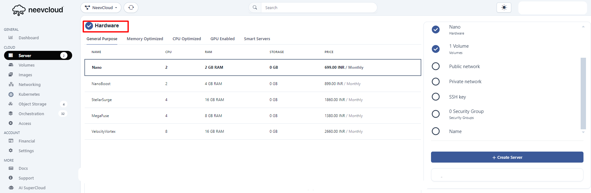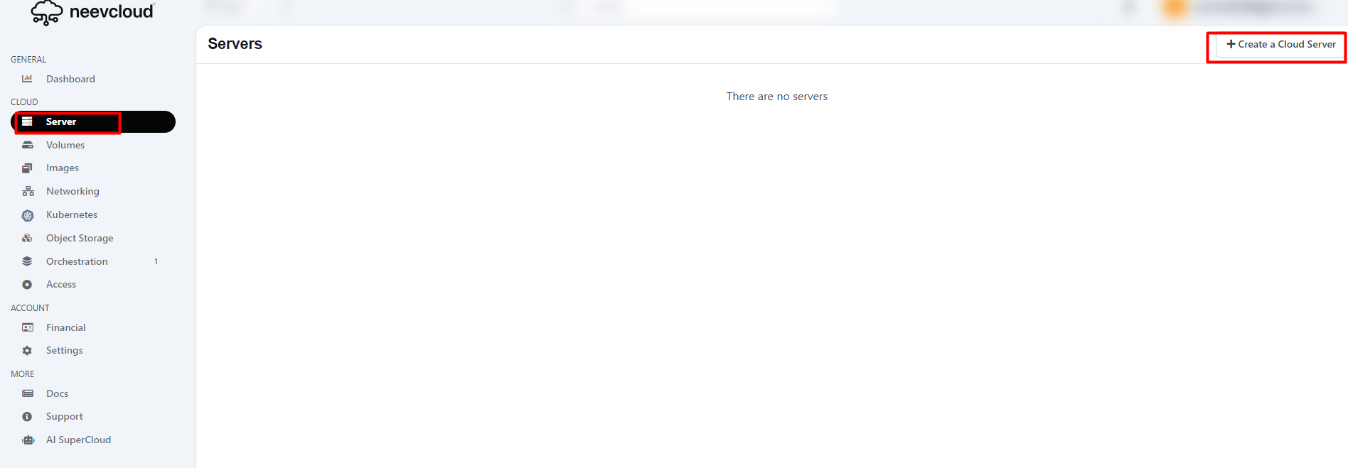 Navigate to the Neevcloud dashboard, select Server, and click Create Cloud Server.