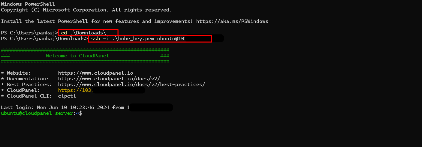 Now How to access the CloudPanel follow these steps, First, access the server via SSH using your SSH key. also if you want to access it by using Putty follow these [links](https://docs.neevcloud.com/neevcloud-guide/neevcloud-knowledgebase/how-to-use-putty-for-ssh-key-based-authentication). Open the command prompt and navigate to the directory where you downloaded the SSH files.