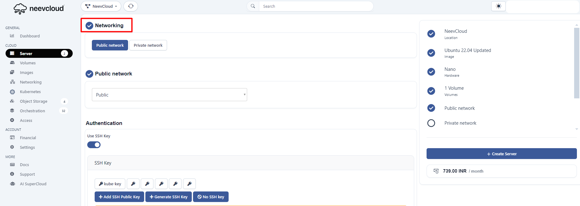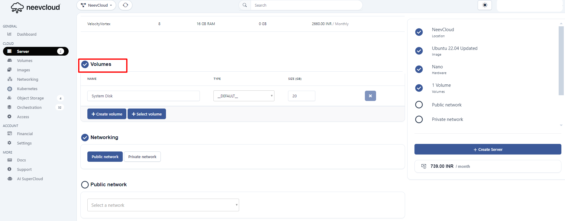 Navigate to the Neevcloud dashboard, select Server, and click Create Cloud Server.