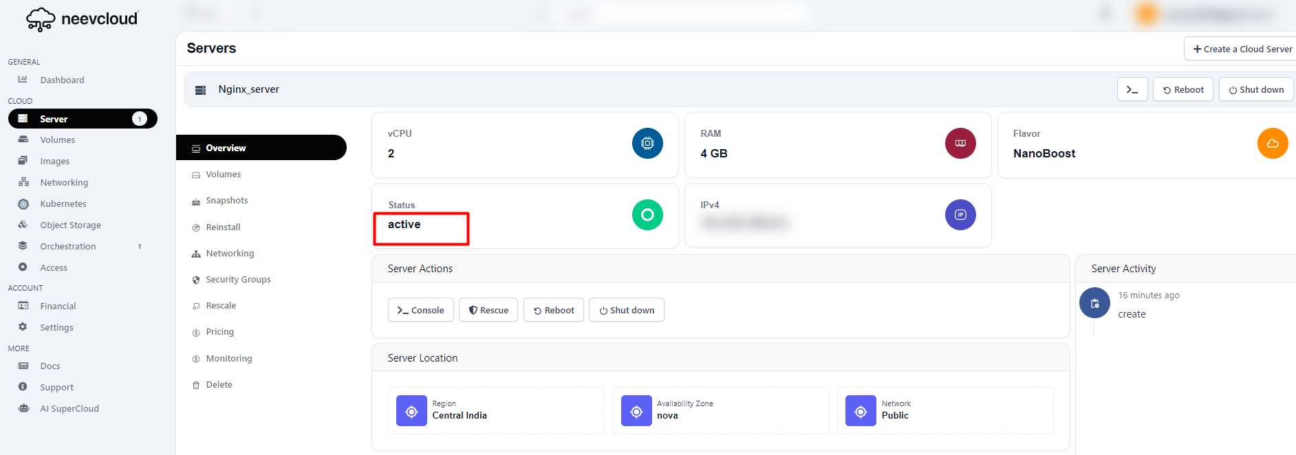 Once your instance is created the status will change to Active, and other details will be shown.