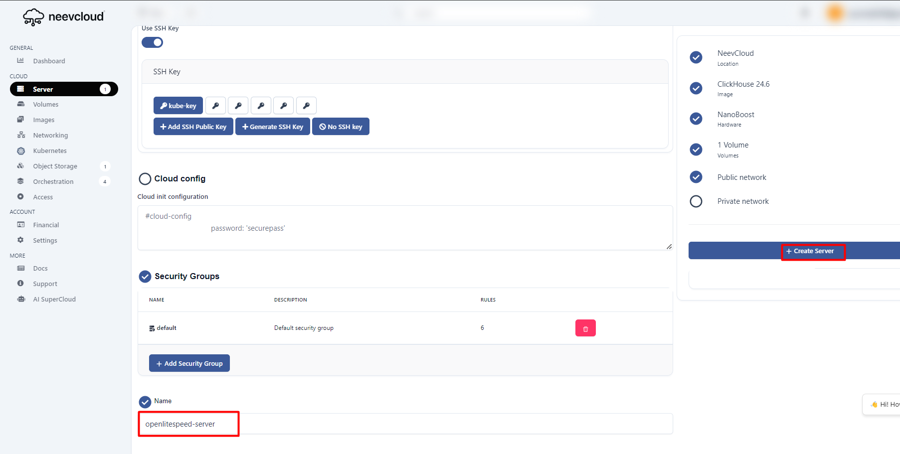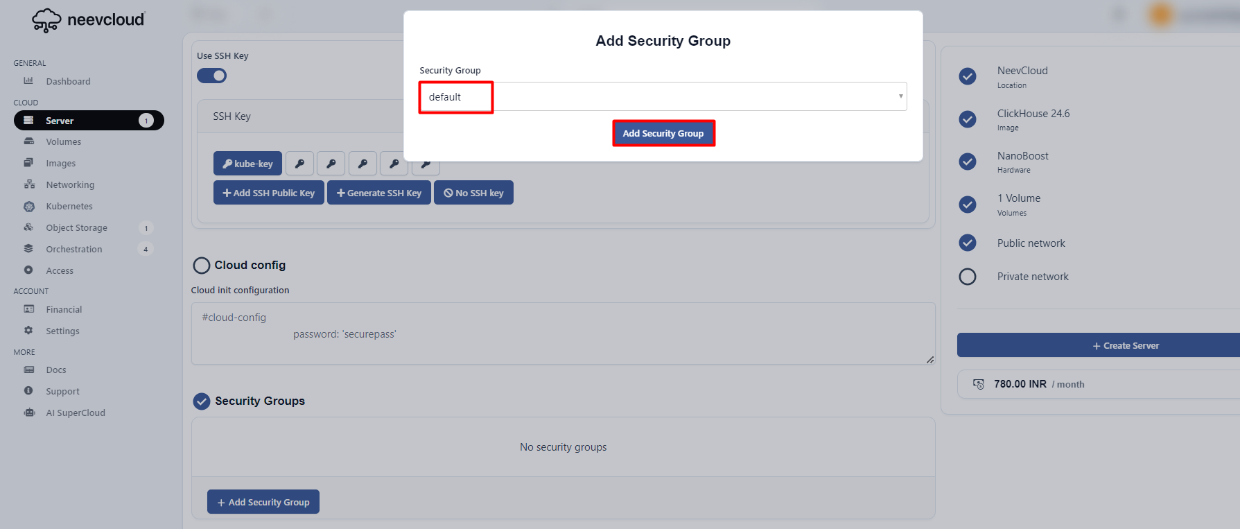 If you already have an SSH key, select it. If you don't have one, please follow this [link](https://docs.neevcloud.com/neevcloud-products/access-details/ssh-key) to generate an SSH key