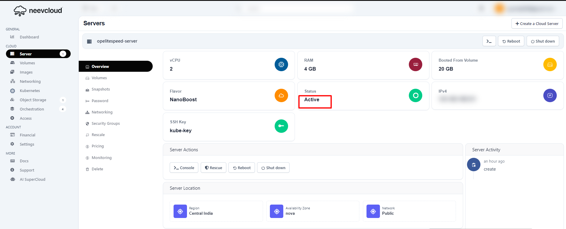 Once your instance is created the status will change to Active, and other details will be shown.