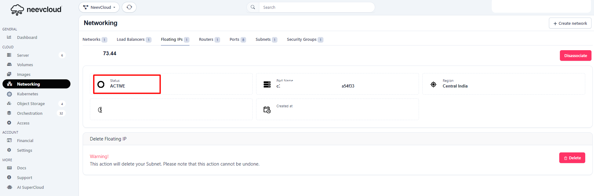 In this section, we have details about the ports and floating IPs.
