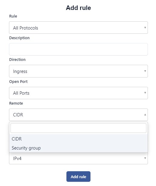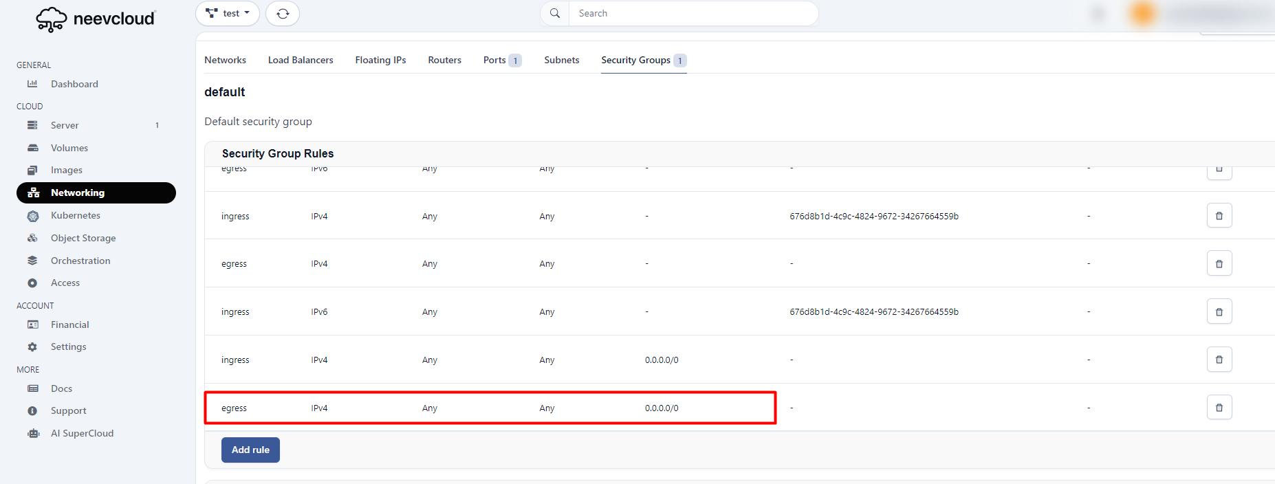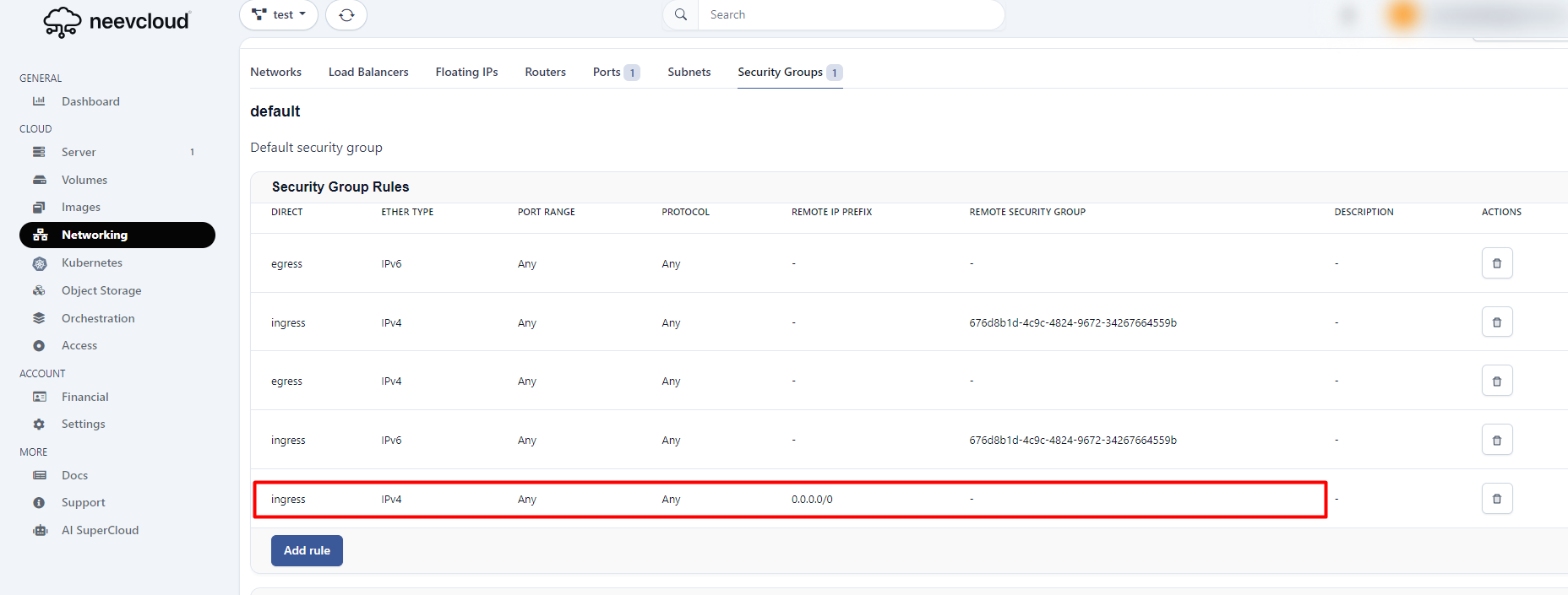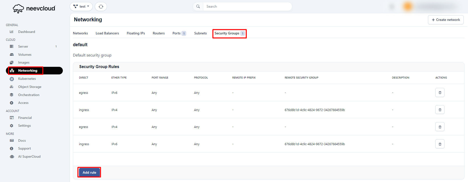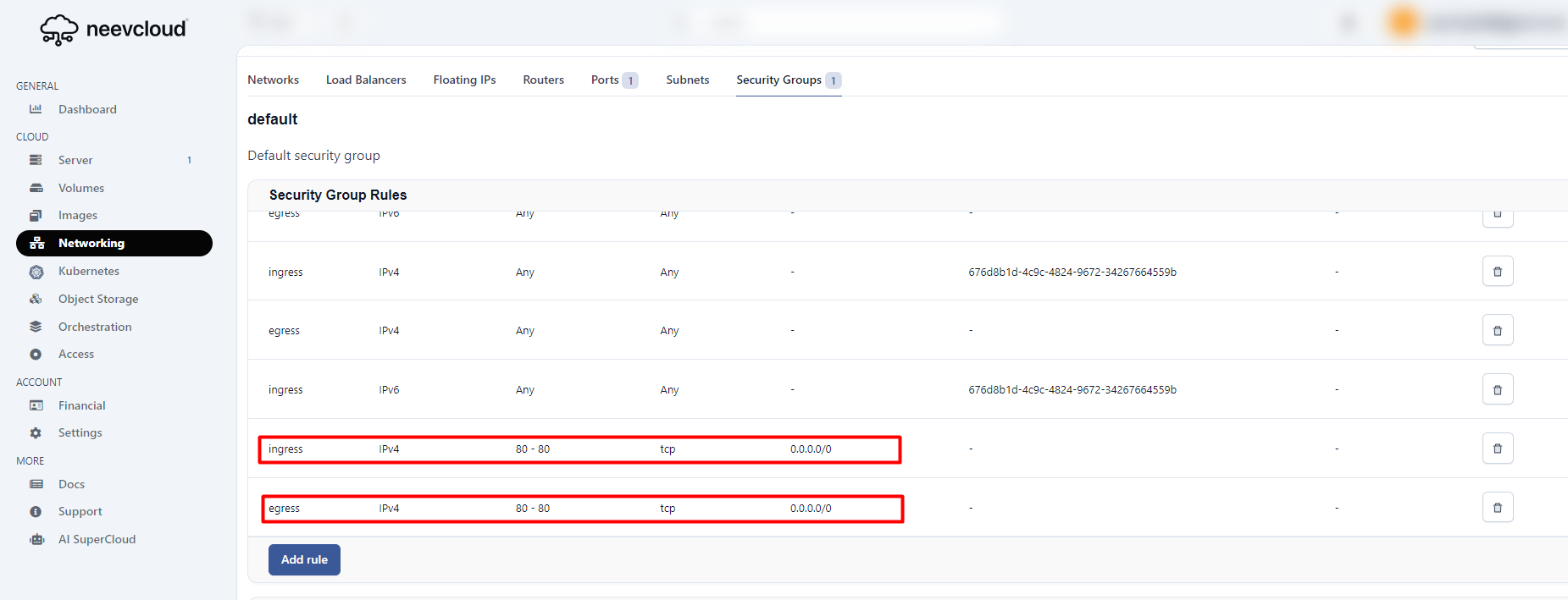If you have not added a security group, follow this [`link`](https://docs.neevcloud.com/neevcloud-products/networking/security-groups/add-security-group):