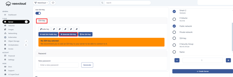 If you already have an SSH key, select it. If you don't have one, please follow this [link](https://docs.neevcloud.com/neevcloud-products/access-details/ssh-key) to generate an SSH key.