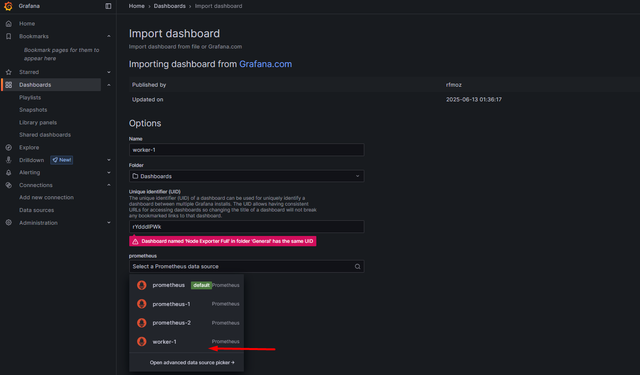 For the node exporter ID, navigate to the node exporter [website ](https://grafana.com/grafana/dashboards/1860-node-exporter-full/)