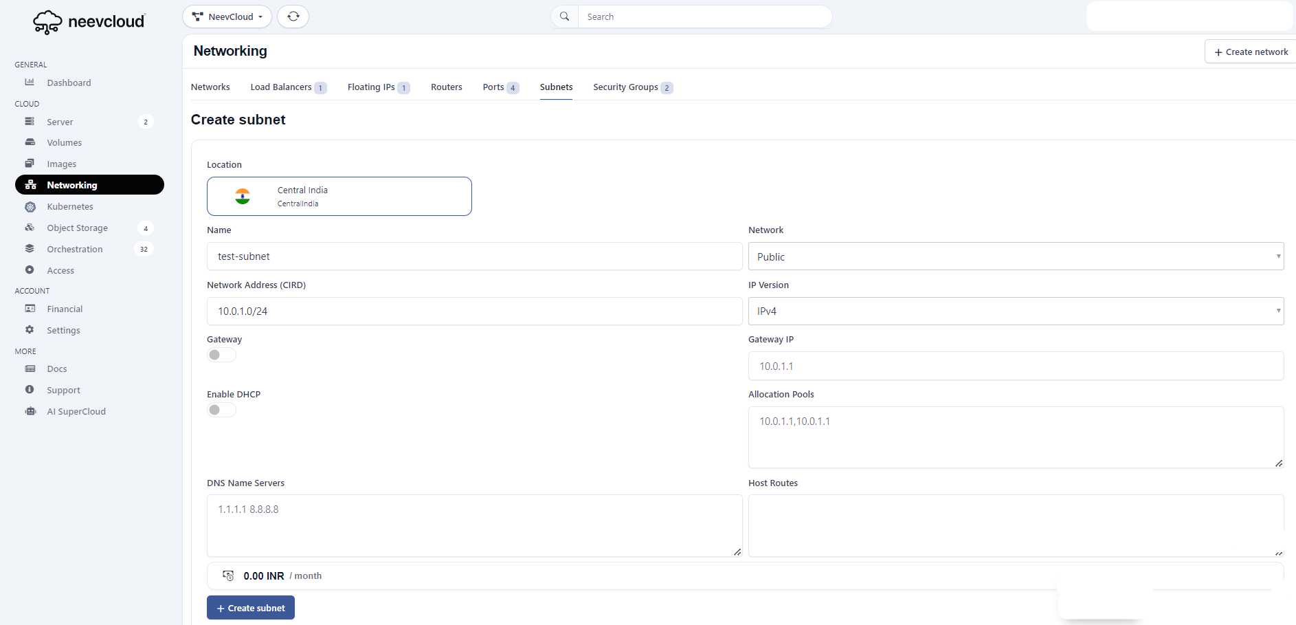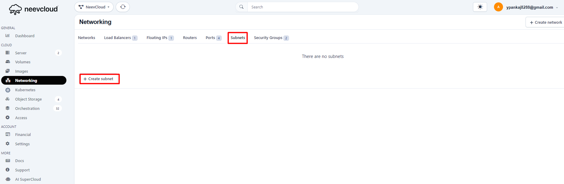 Click on Networking, choose a subnet, and then add new subnets.