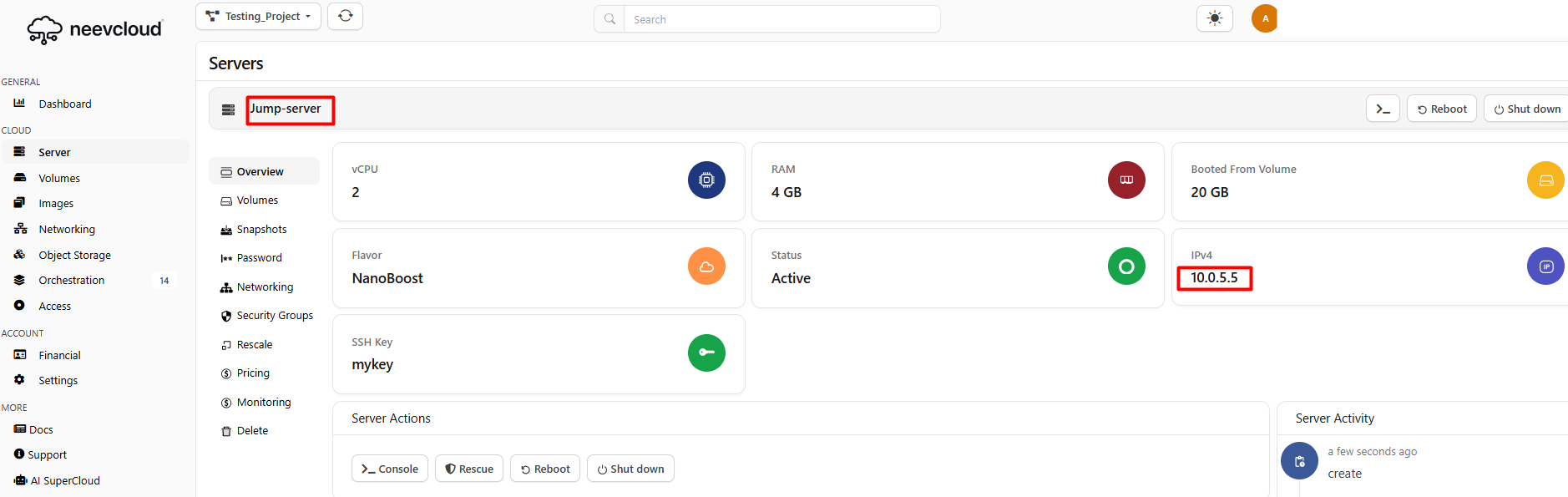 Once the Jump Server is successfully launched, allocate the assigned Floating IP to it