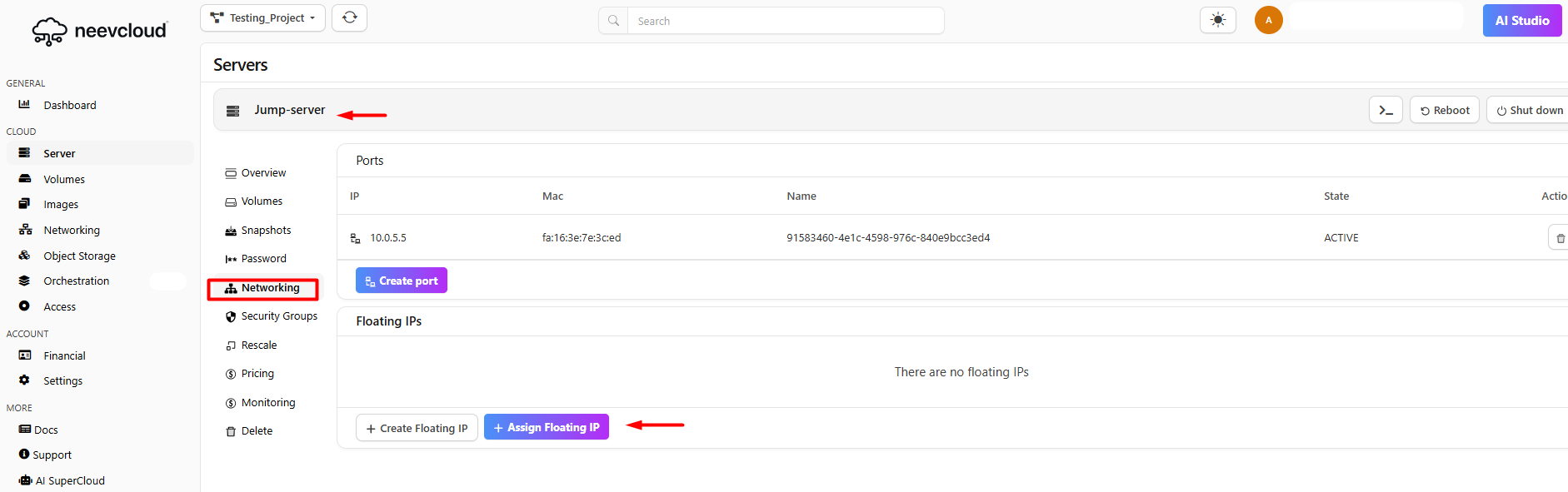 Now go back to the Jump Server, click on the Networking section, and assign the Floating IP.