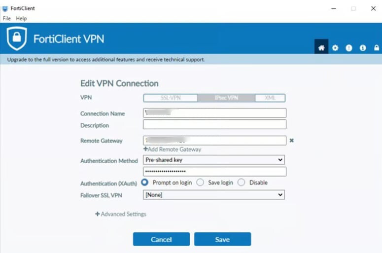 * Enter the VPN Name, Remote Gateway (public IP of FortiGate), and Pre-Shared Key.