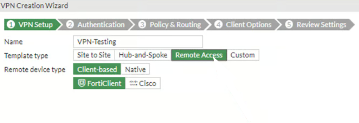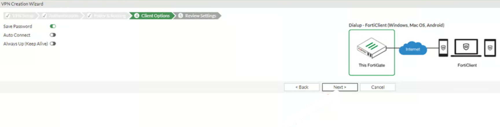 7. **Security Policy:**  Ensure the policy for the VPN traffic is automatically created. If not, you will need to create it manually.