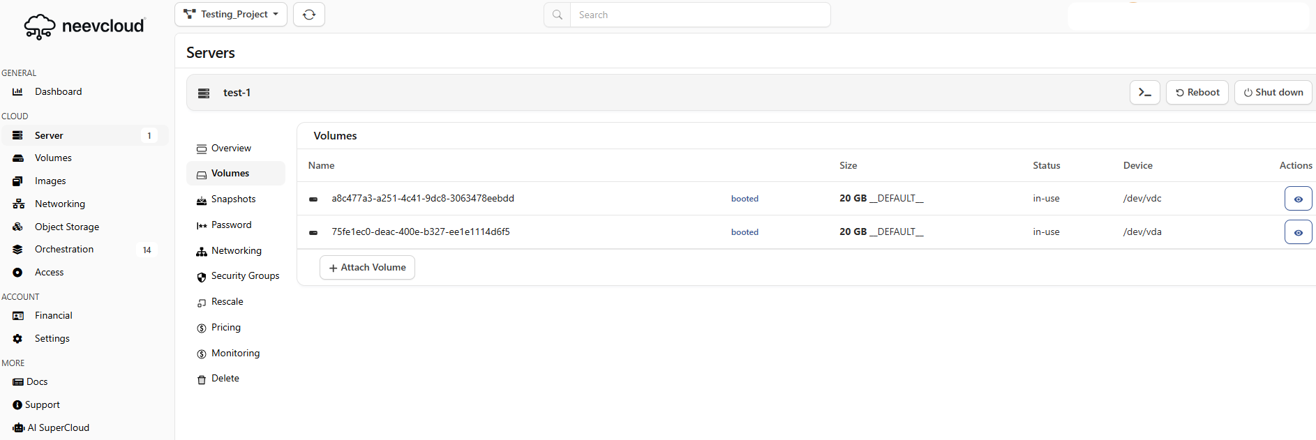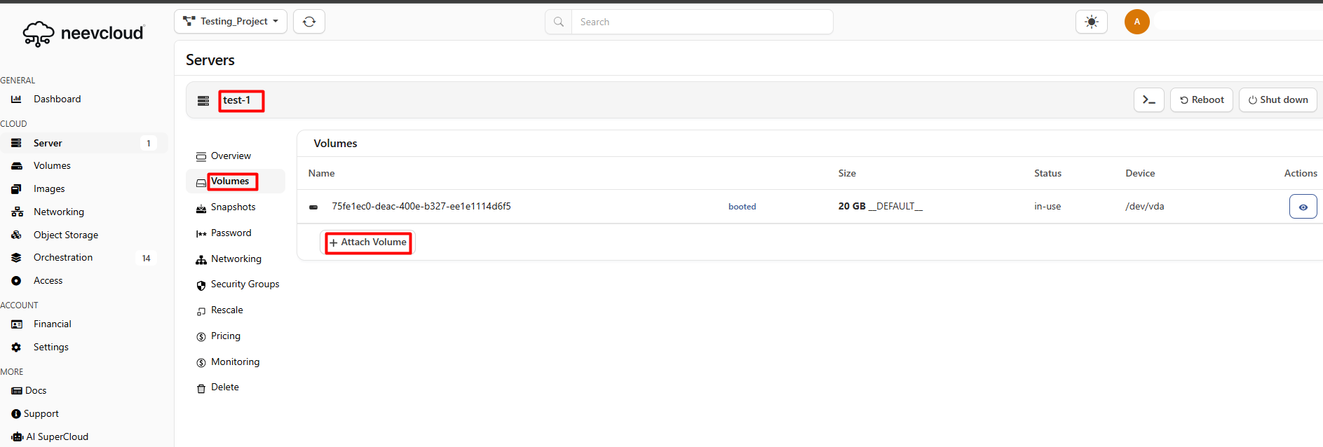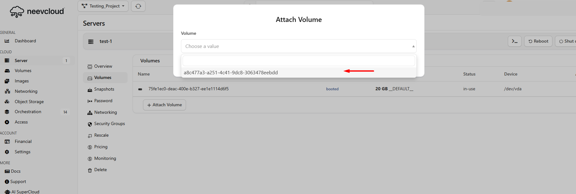 Now open another instance, test-,1, and navigate to the volume section, click on the attach volume.&#x20;